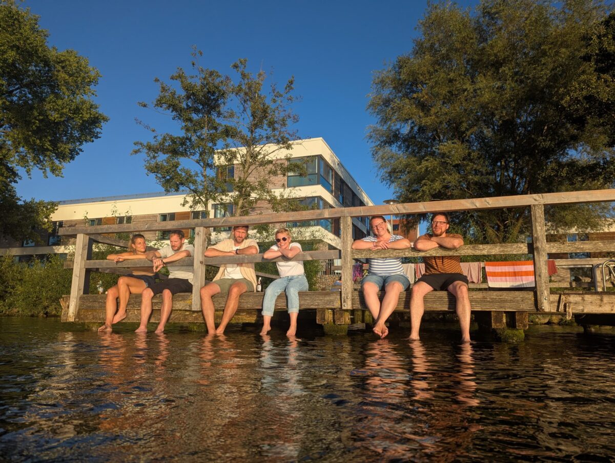 Sechs Sänger*innen genießen das Chorwochenenden mit den Füßen im See